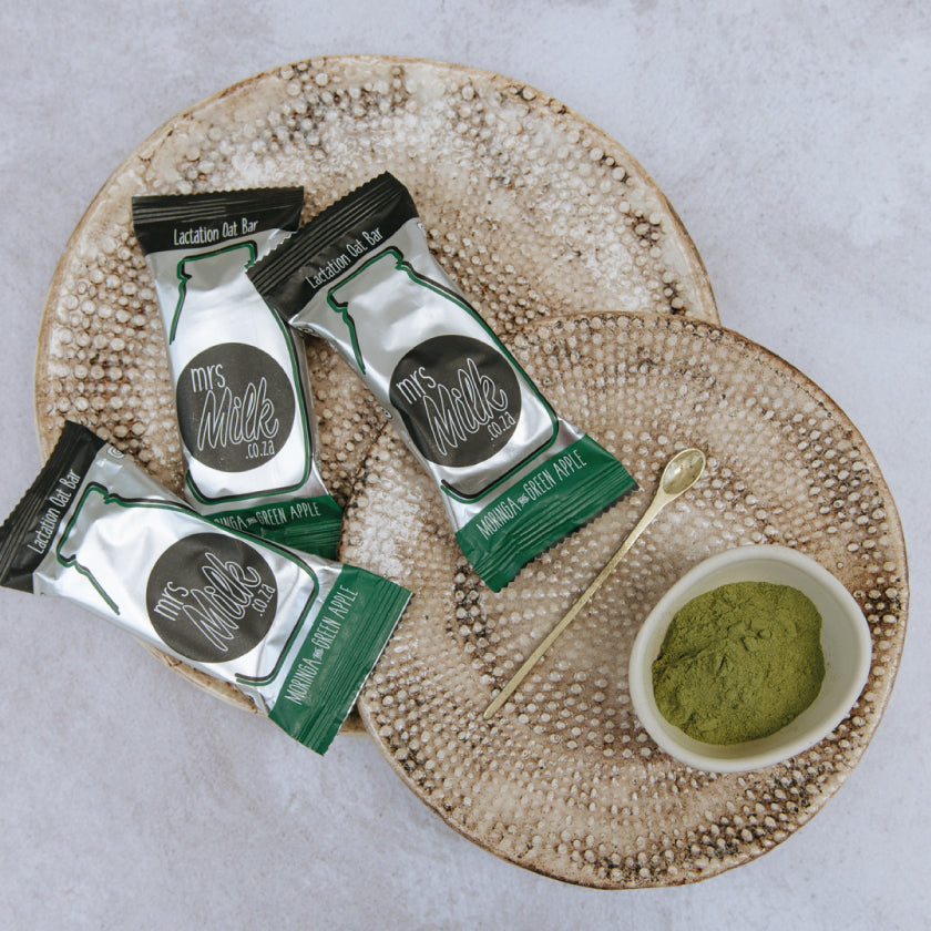 Moms often ask me if our Moringa & Green Apple Mrs Milk Lactation Oat Bars are caffeinated because they notice a surge of energy on the days they eat one